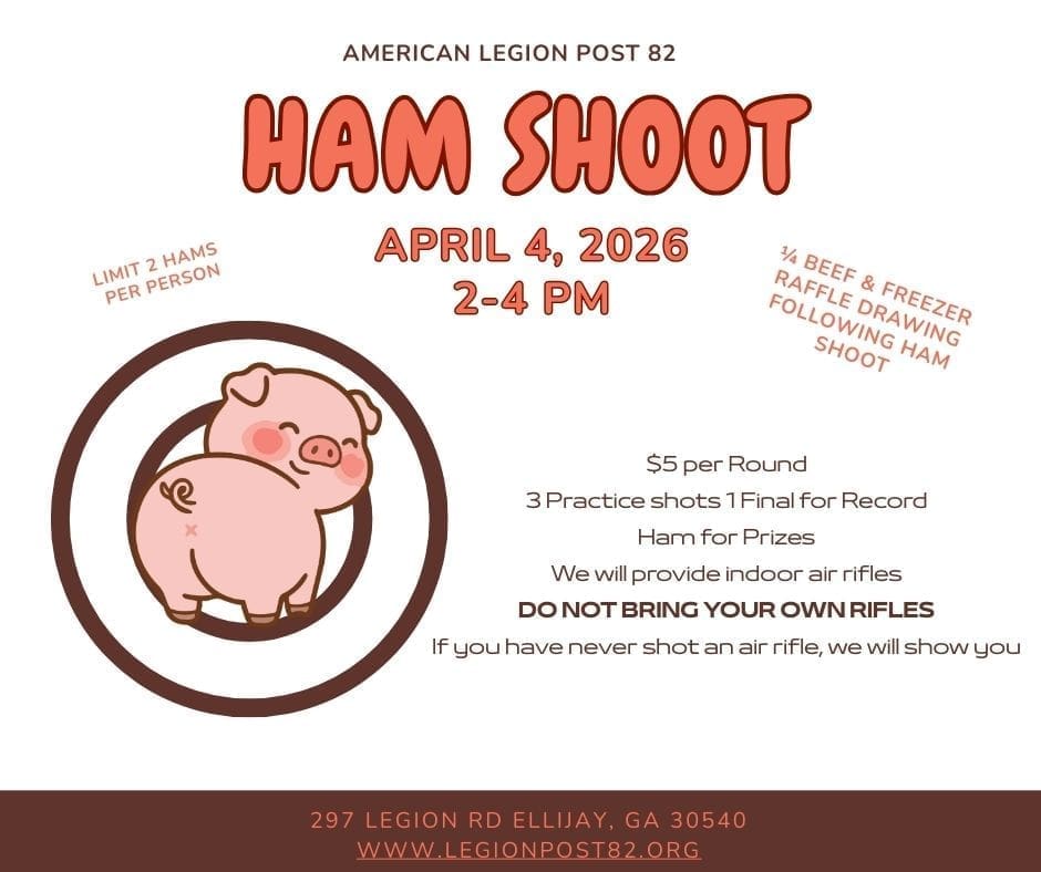 Home / Community Events / Ham Shoot at Legion Post 82 « All Events Ham Shoot at Legion Post 82 April 4 @ 2:00 pm - 4:00 pm $5 « Easter on the Farm Open Mic Night at Legion Post 82 » Add to calendar Google Calendar iCalendar Outlook 365 Outlook Live Details Date: April 4 Time: 2:00 pm - 4:00 pm Cost: $5 Event Category: Things To Do Organizer American Legion Post 82 Phone 706-276-4878 Email americanlegionellijay@gmail.com Organizer Website » Venue American Legion Post 82 297 Legion Road Ellijay, GA 30540 United States + Google Map Phone 706-276-4878 Venue Website » Related Events Love is the Hunt Adventure: A Valentine’s Day Tour February 14 @ 9:00 am - 5:30 pm Snuggles with Baby Lambs at Cress Creeks Farm February 14 @ 11:00 am - 3:00 pm Valentine’s Day Truffle & Wine Pairing February 14 @ 12:00 pm - 5:00 pm